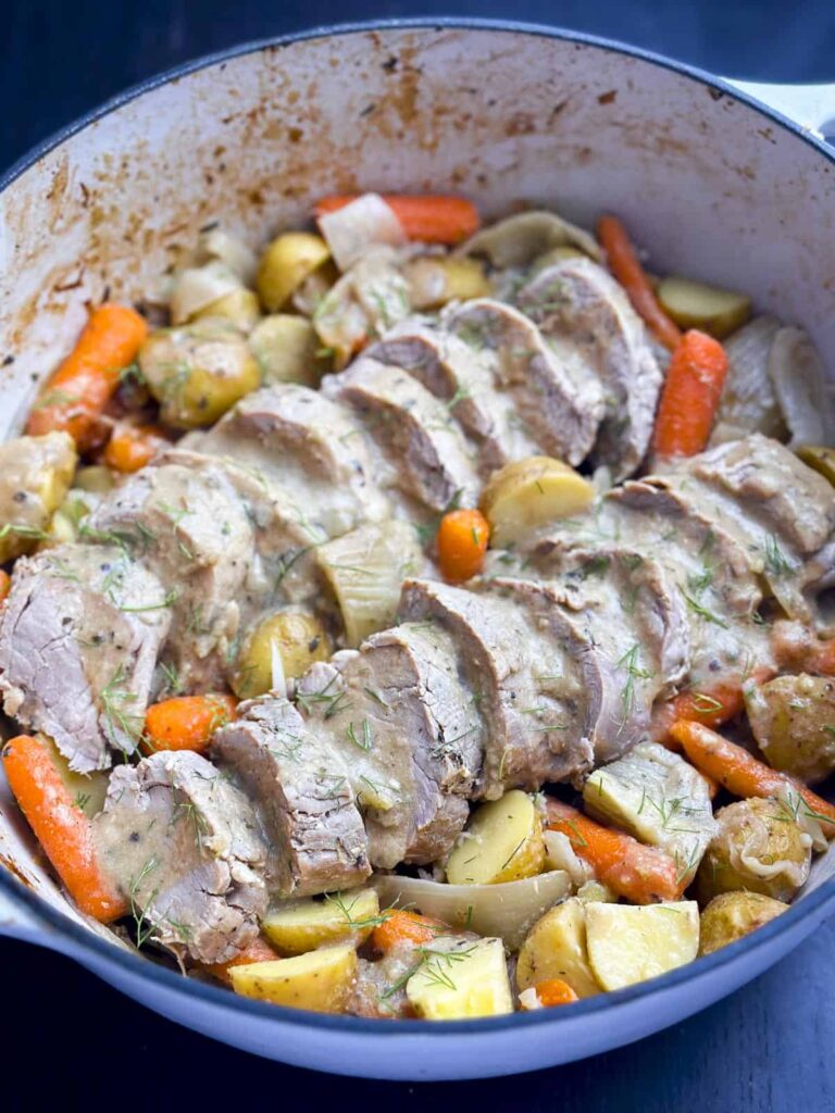 This one-pot Dutch oven pork tenderloin is the ultimate cozy dinner for chilly days—comforting, flavorful, and wonderfully satisfying. Juicy, perfectly seared pork roasts alongside caramelized fennel, tender potatoes, and sweet carrots, all soaking up rich, savory goodness. Finished with a luscious maple Dijon pan sauce, every bite is packed with warmth and depth—perfect for a comforting family meal or an impressive yet easy weekend dish.