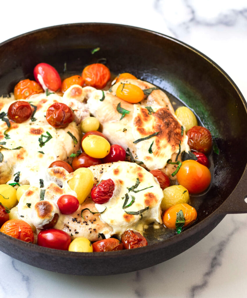 One Pan Caprese Chicken is a fresh, wholesome skillet meal that brings together simple, vibrant ingredients in the best way. Tender, juicy chicken breasts are cooked with ripe, blistered tomatoes, then topped with creamy fresh mozzarella that melts beautifully into the dish. Finished with fragrant basil, it’s light, flavorful, and perfectly balanced. Easy enough for a weeknight but fresh and elegant enough for guests, this healthy meal is one the whole family will enjoy.