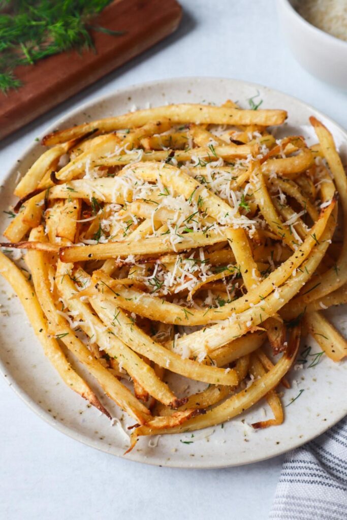 20-Minute Roasted Air Fryer Parsnips are crispy, golden, and full of flavor, making them an irresistible and healthy alternative to traditional french fries. Lightly seasoned and finished with parmesan and fresh herbs, they deliver the perfect balance of savory richness and natural sweetness. Quick and easy to prepare, this simple snack or side dish is ready in just minutes and is perfect for weeknight dinners, meal prep, or guilt-free snacking.