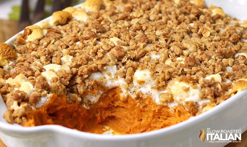 This Slow Cooker Sweet Potato Casserole is the perfect easy Thanksgiving side dish! Creamy, flavorful sweet potatoes are topped with crunchy candied nuts and gooey marshmallows for the ultimate holiday favorite. Made in the crockpot to save oven space, this crowd-pleasing recipe is a must-have on your holiday table.