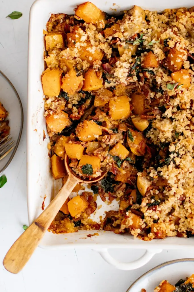 This savory Butternut Squash Casserole is the ultimate fall side dish! Packed with tender roasted butternut squash, crispy bacon, sweet apples, kale, and melted cheese, it’s a flavorful and comforting recipe everyone will love. Finished with a buttery panko topping and baked until golden and bubbly, this easy butternut squash casserole is perfect for Thanksgiving, Christmas, or any cozy autumn meal.