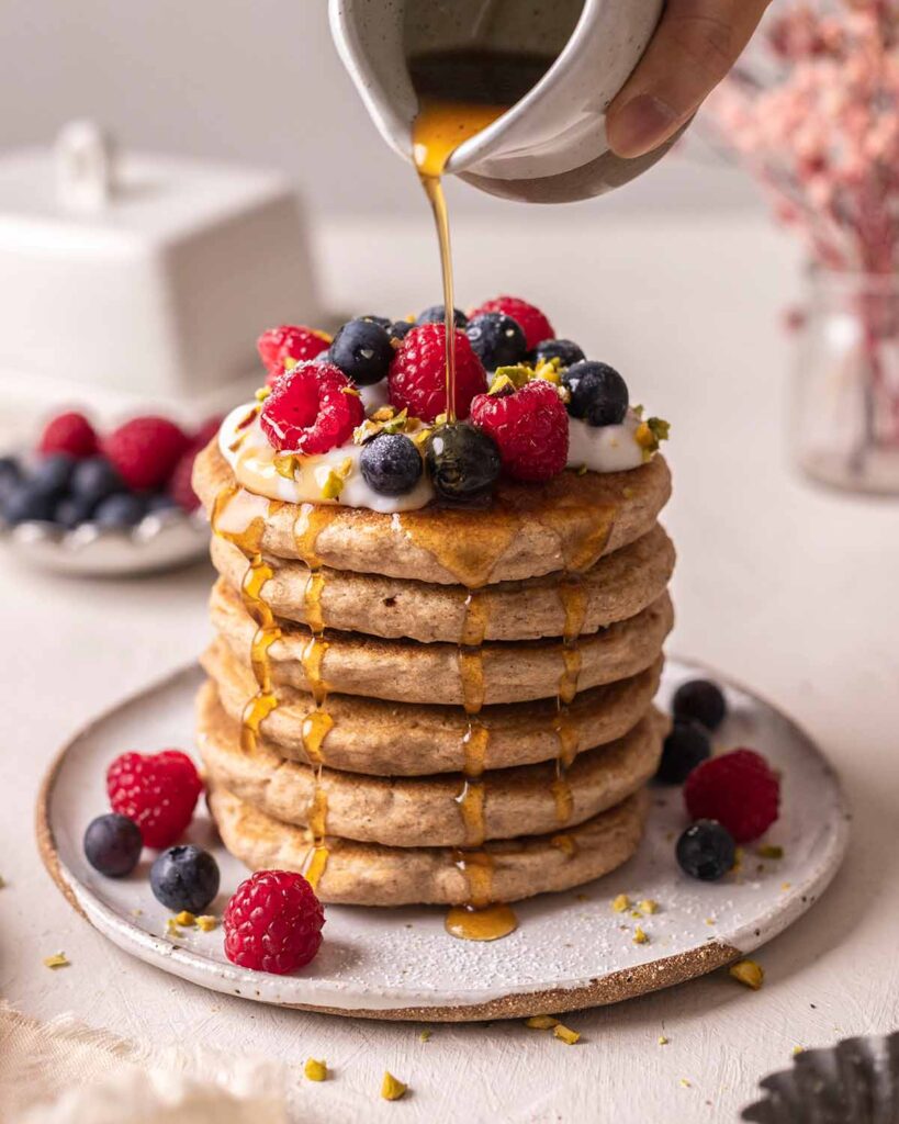 Pancakes with fruit add a delightful twist to the classic stack, bringing bursts of freshness, natural sweetness, and vibrant flavors to your breakfast or brunch.