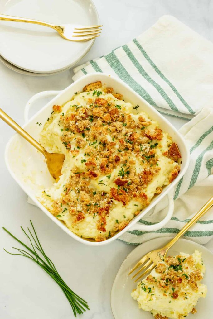 Boursin Mashed Potatoes are a rich, creamy, and utterly delicious side dish. This easy casserole combines Boursin cheese, creamy Greek yogurt, and a crunchy Parmesan breadcrumb topping for a comforting, flavorful treat.