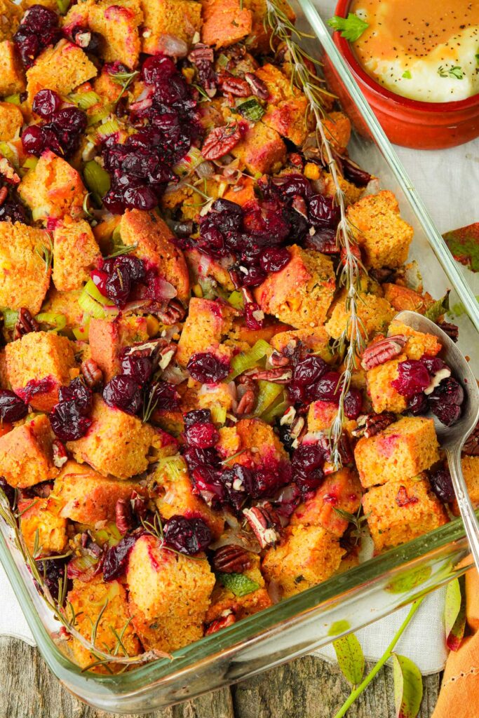 This simple vegan cornbread stuffing is bursting with flavor from sautéed leeks, slightly softened cranberries in orange juice, and toasted pecans. It’s an effortless, crowd-pleasing side that no one would guess is entirely plant-based.