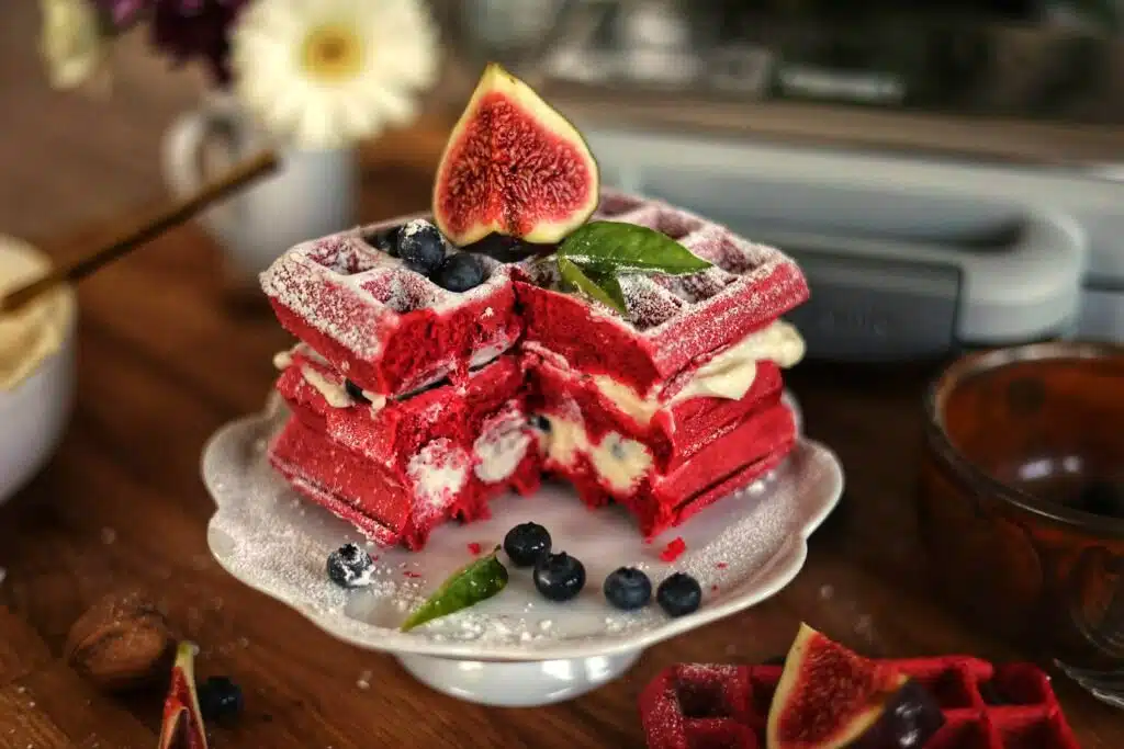 Whether you call it a unique breakfast or a red velvet twist, these soft and fluffy red velvet waffles are a delightful treat. Topped with a light, creamy layer of whipped cream cheese and fresh, juicy blueberries, they strike the perfect balance of sweetness and tang.