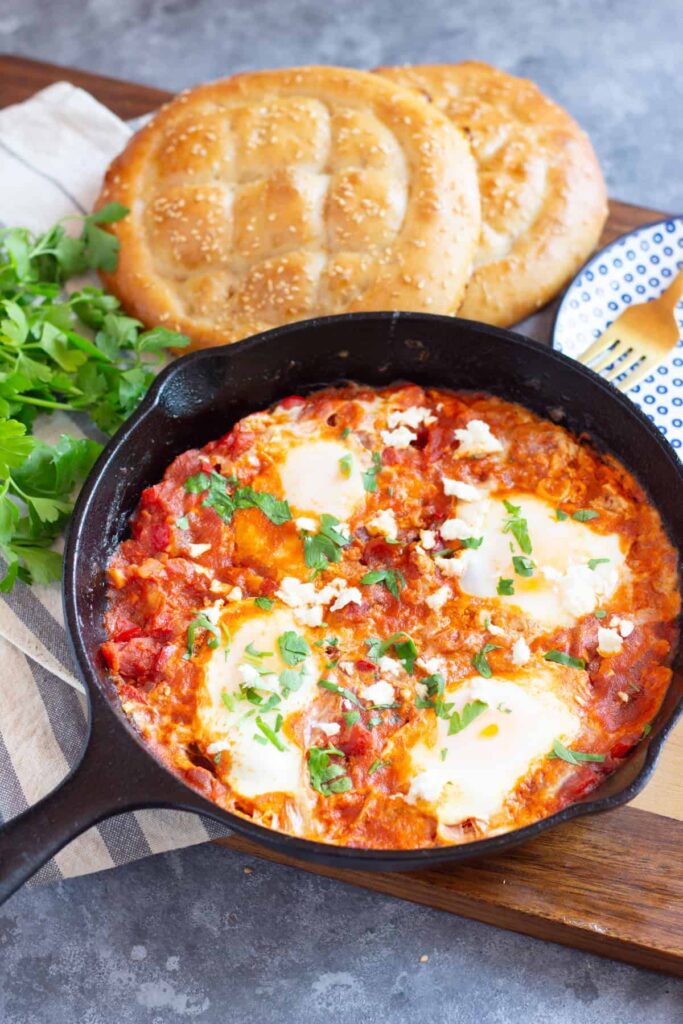 This shakshuka with feta will elevate your brunch! Poached eggs simmered in a rich tomato sauce and topped with crumbled feta create a delicious, crowd-pleasing dish everyone will love.