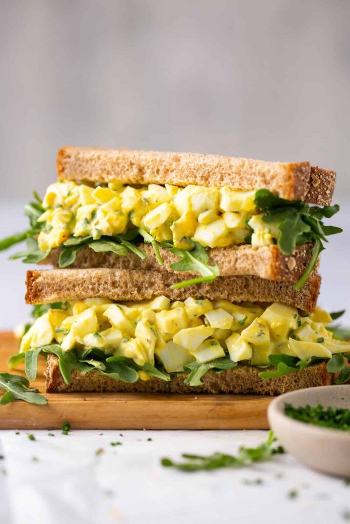 This healthy, low-calorie egg salad is creamy, tangy, fresh, and full of flavor. It’s absolutely perfect served on toasted bread with a handful of peppery arugula. You can also turn it into a delicious sandwich, tuck it into a wrap or pita, or simply enjoy it on its own for a light and satisfying meal.