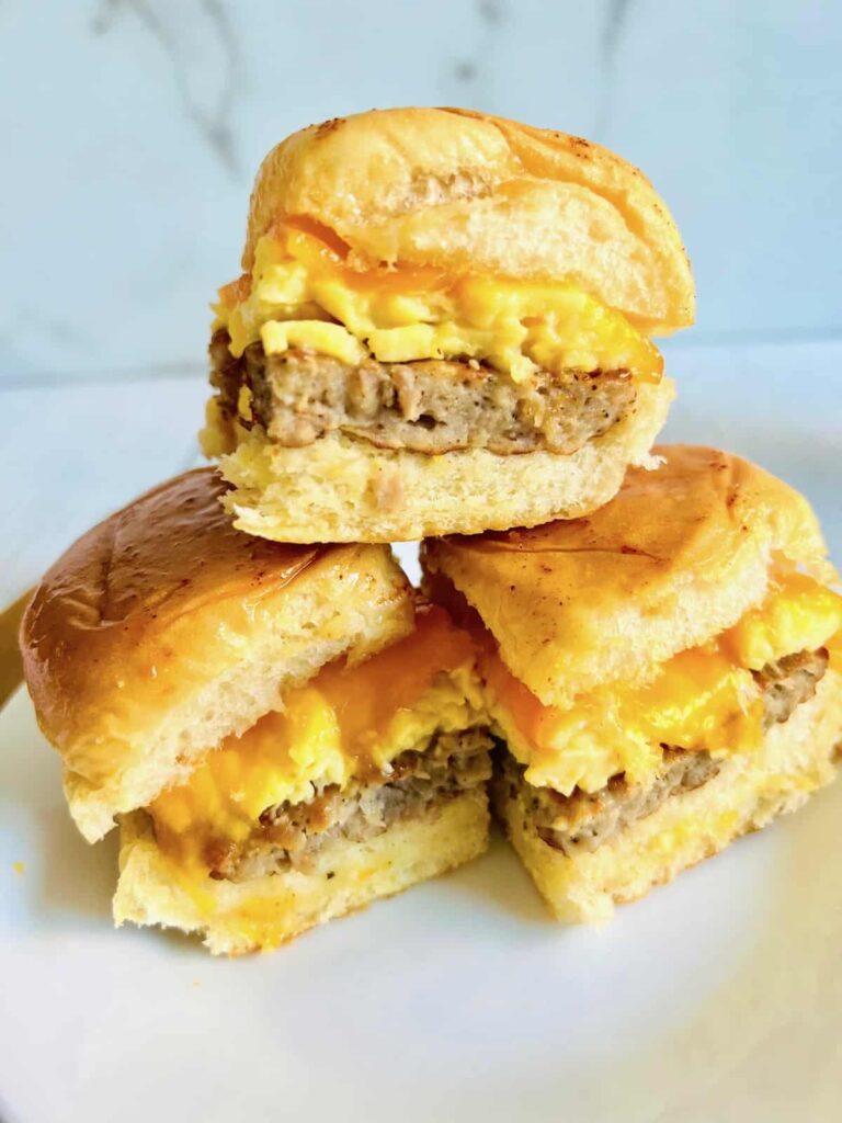 King’s Hawaiian Roll Breakfast Sliders are the ultimate 30-minute recipe, perfect for brunch, lunch, or dinner. Soft rolls drizzled with maple syrup are piled high with melty cheese, fluffy eggs, and hearty sausage — perfectly sweet, salty, and savory in every bite!
