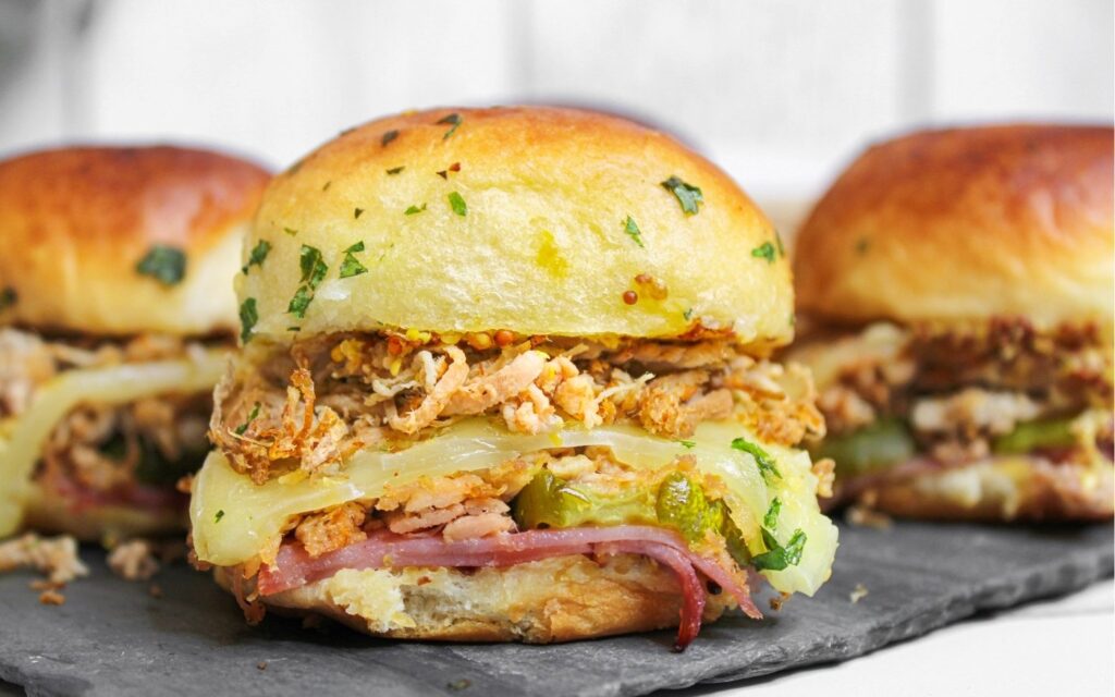 This Slow Cooker Cuban Sliders recipe is bold, flavorful, and perfect for feeding a crowd. Layers of shredded mojo pork, deli ham, Swiss cheese, pickles, and tangy Dijon mustard are piled onto soft Hawaiian rolls, then baked until golden and melty with a buttery garlic topping. Ideal for parties, game day, or an easy weeknight dinner!