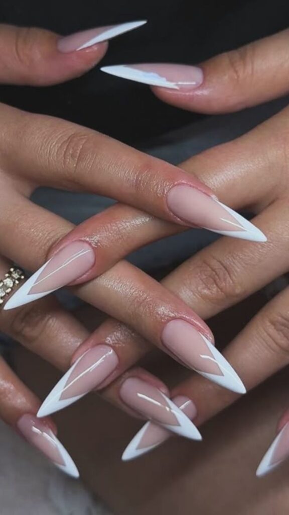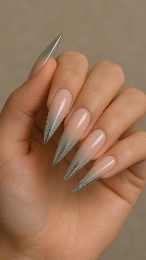 Sleek nude nails with sharp metallic silver tips for a futuristic vibe.