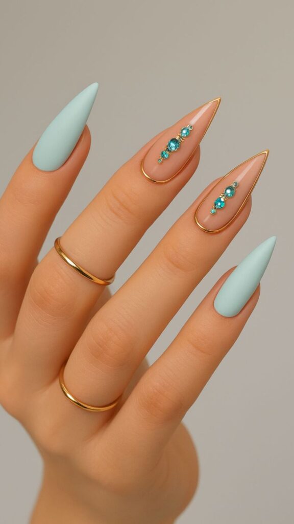 Soft mint nails with rhinestone embellishments for a subtle sparkle.