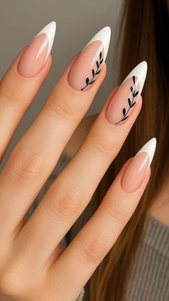 Nude nails with tiny black botanical designs for a clean, artistic look.