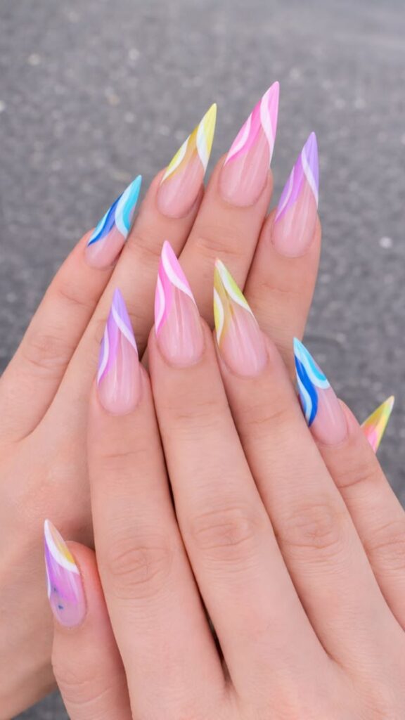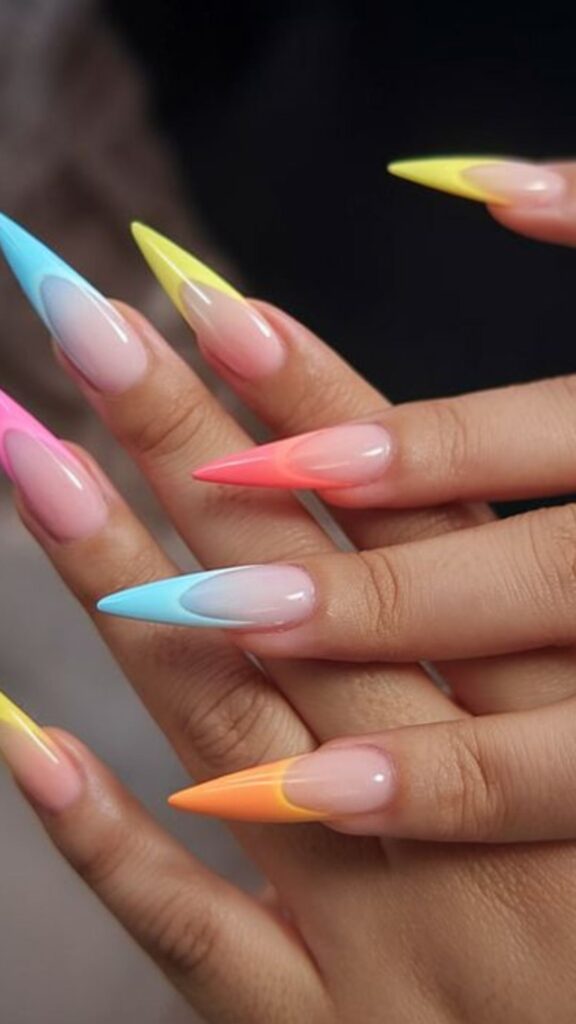 Soft nude base with colorful neon pastel tips, playful and eye-catching.