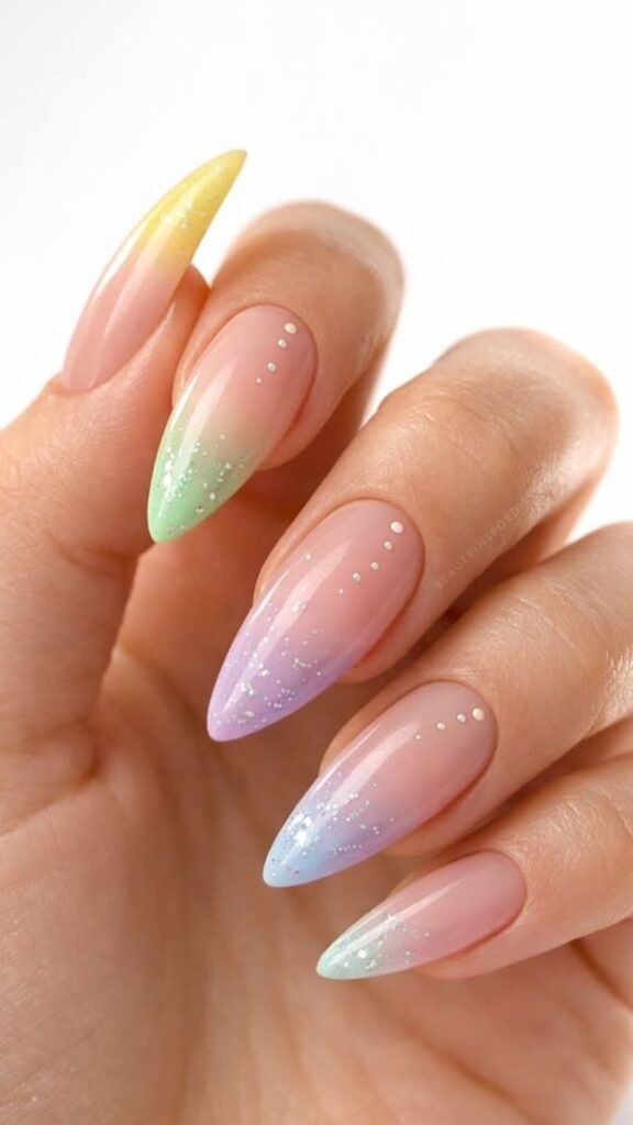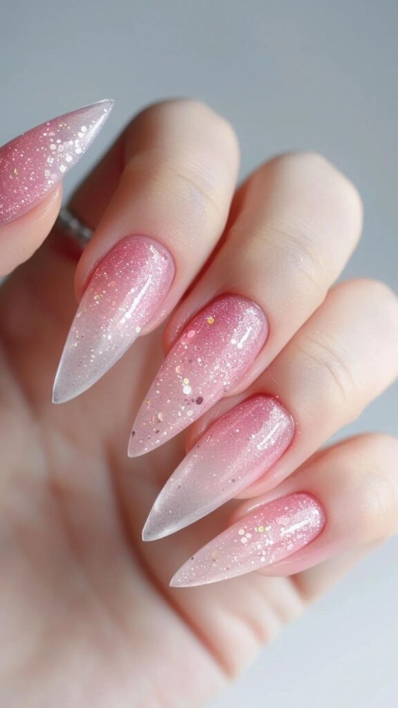 Light pink ombre with fine glitter for a soft, glamorous finish.
