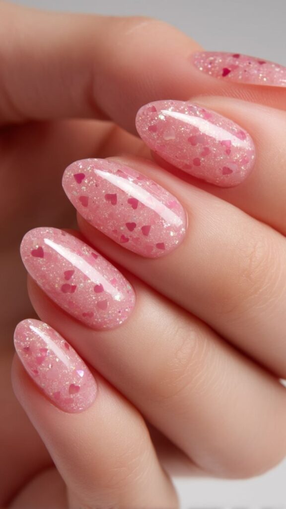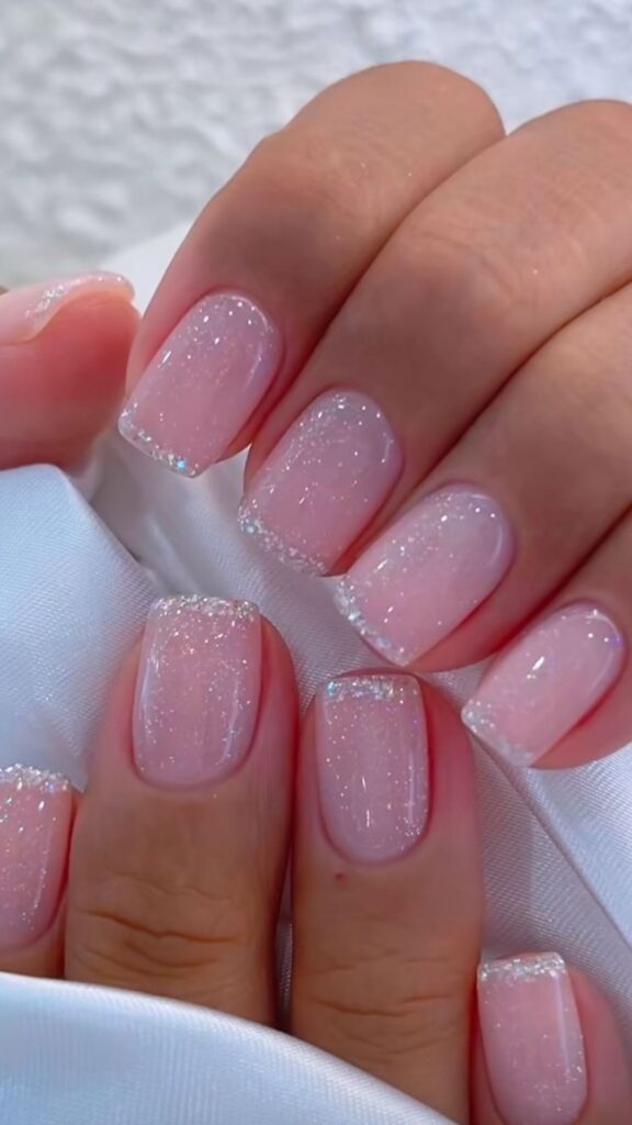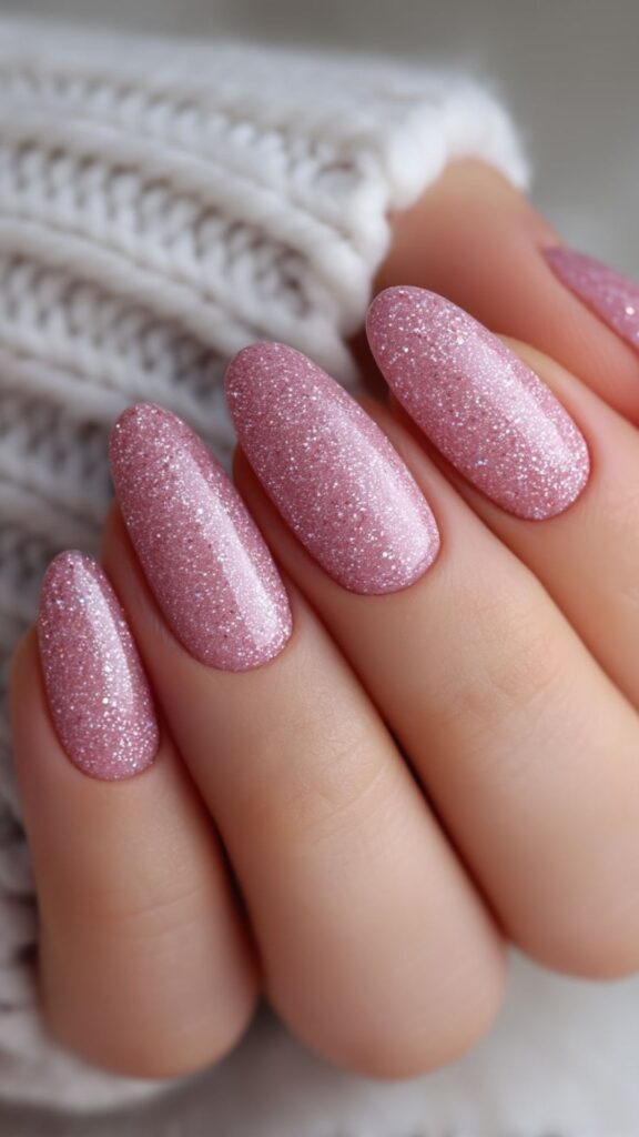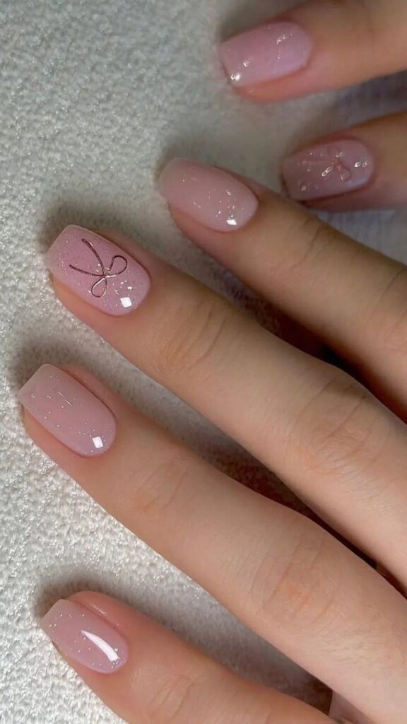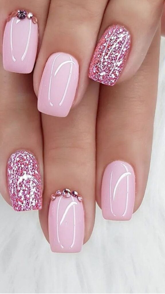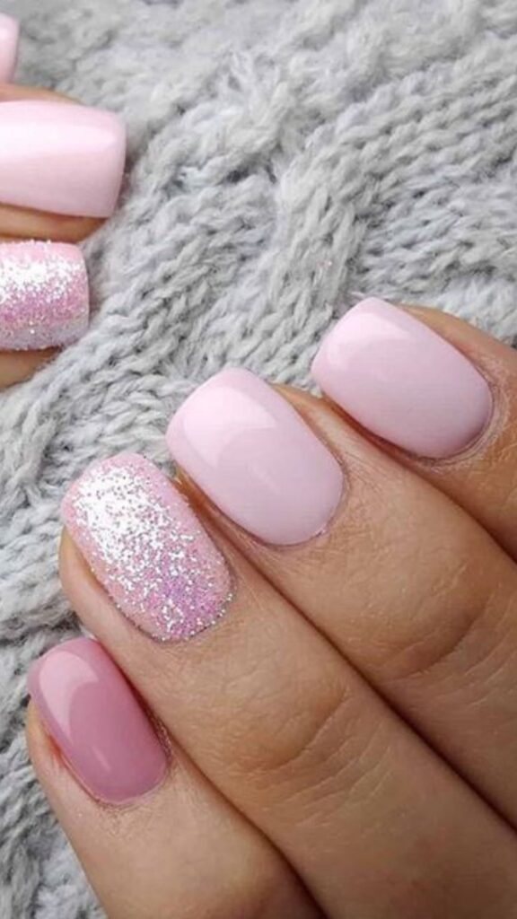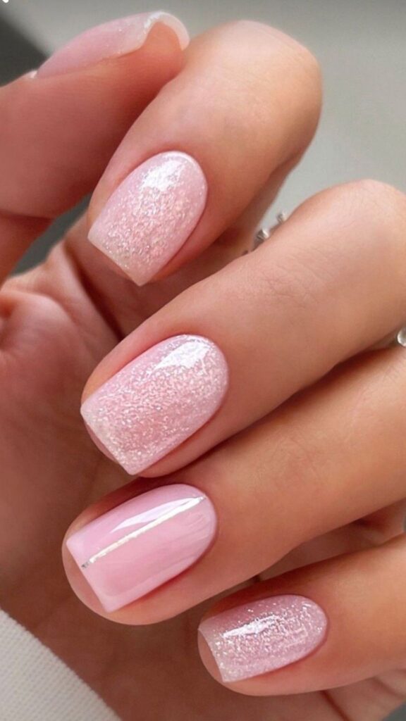 Light pink manicure with a glittery pink accent nail for a subtle sparkle effect.