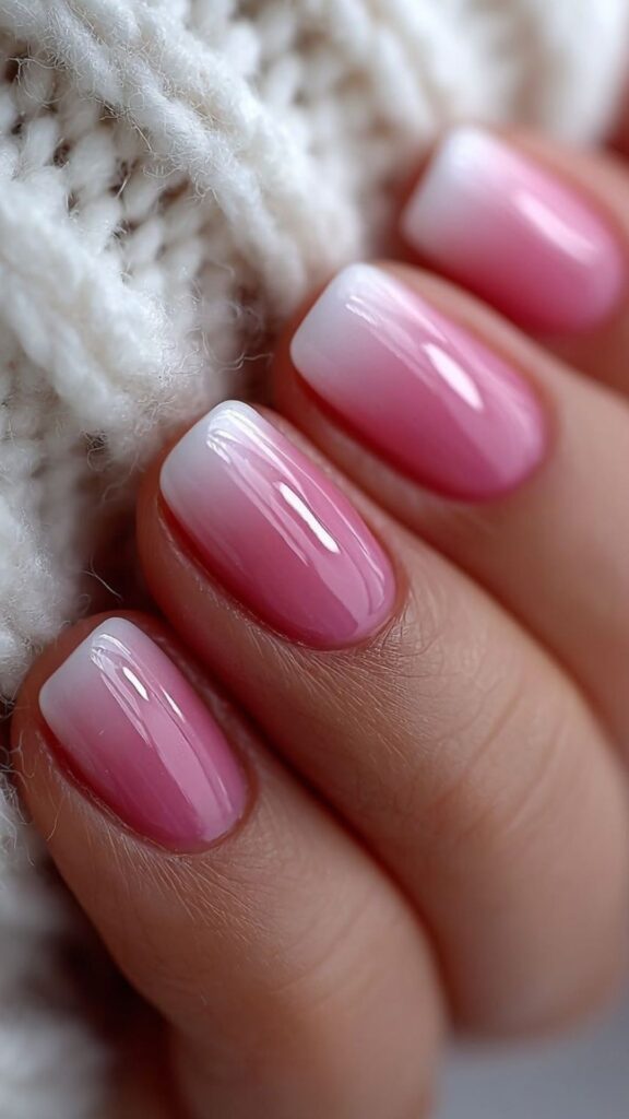 Medium-length square nails in soft pink ombré. Smooth gradient for a delicate look.