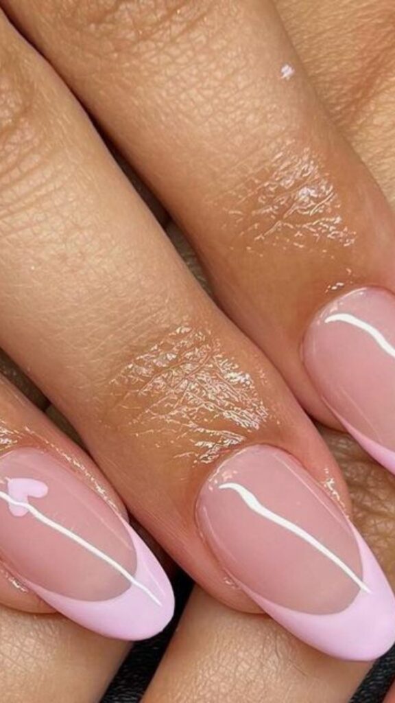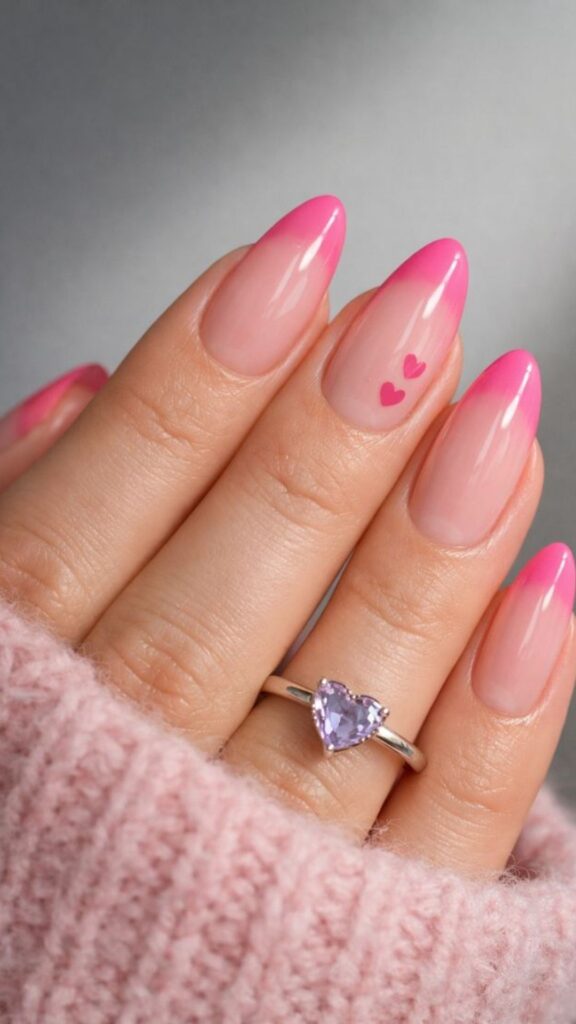Long almond nails with a smooth transition from nude base to vibrant pink tips. One nail has a tiny heart detail for a romantic touch.