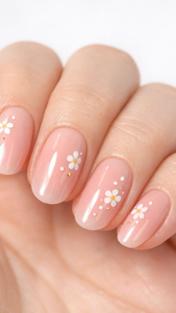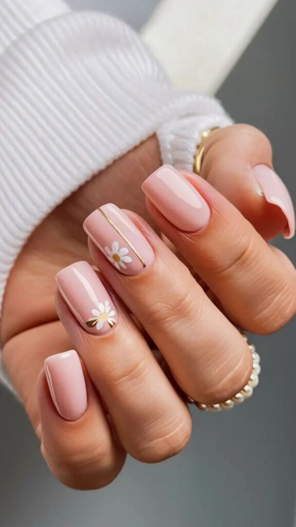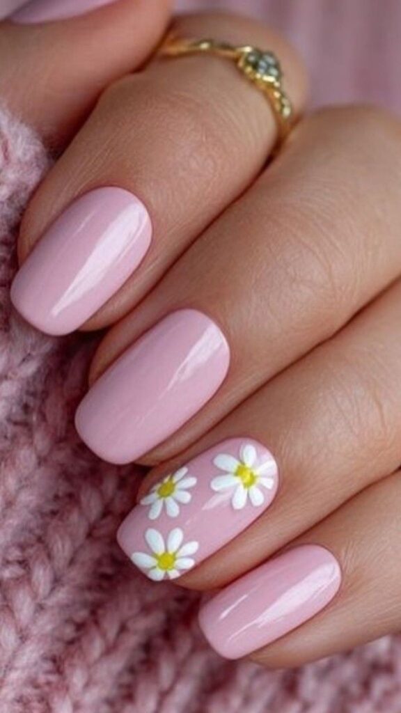 Short oval nails in soft pink with small white daisies. A delicate and fresh spring manicure.