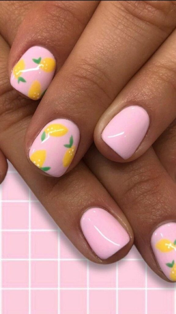 Short oval nails in soft pink with accent nails featuring small lemons on a pastel background. A very fresh and playful spring design.