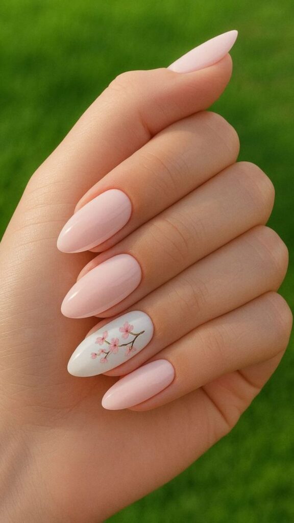 Soft pink base with daisy accents on one nail. A light floral touch on a neat oval shape.