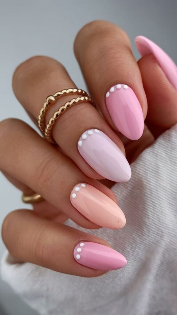 Oval nails in different shades of pink (a gradient effect across the hand). Soft and cozy look.