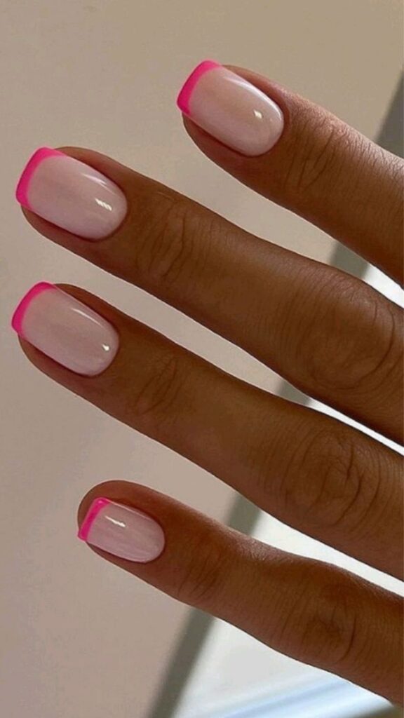 Nude base with a thin bright pink French line along the edge. A modern and more graphic take on the classic French manicure.