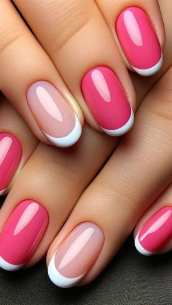 Bright pink manicure with white French tips on several nails. A bold and fresh look.