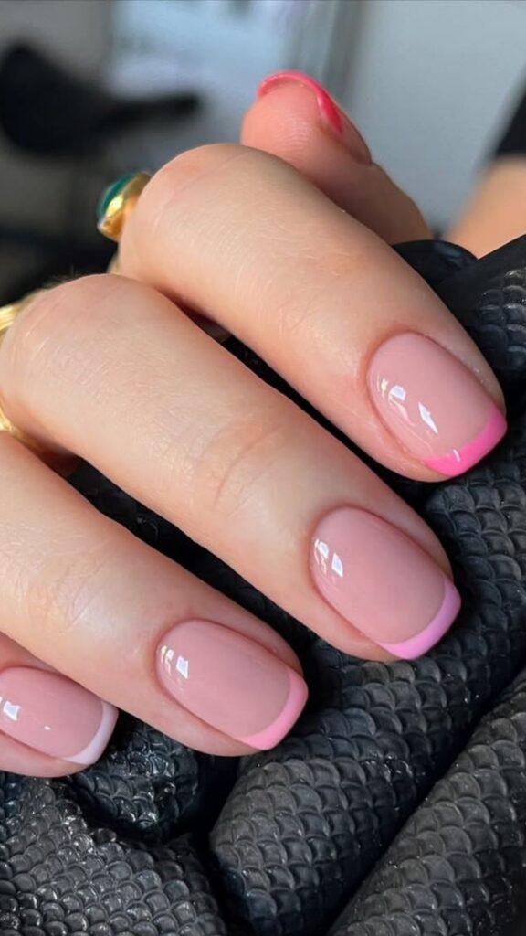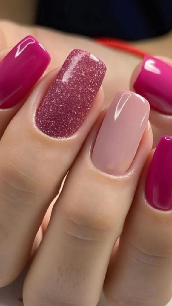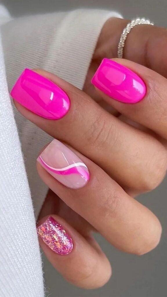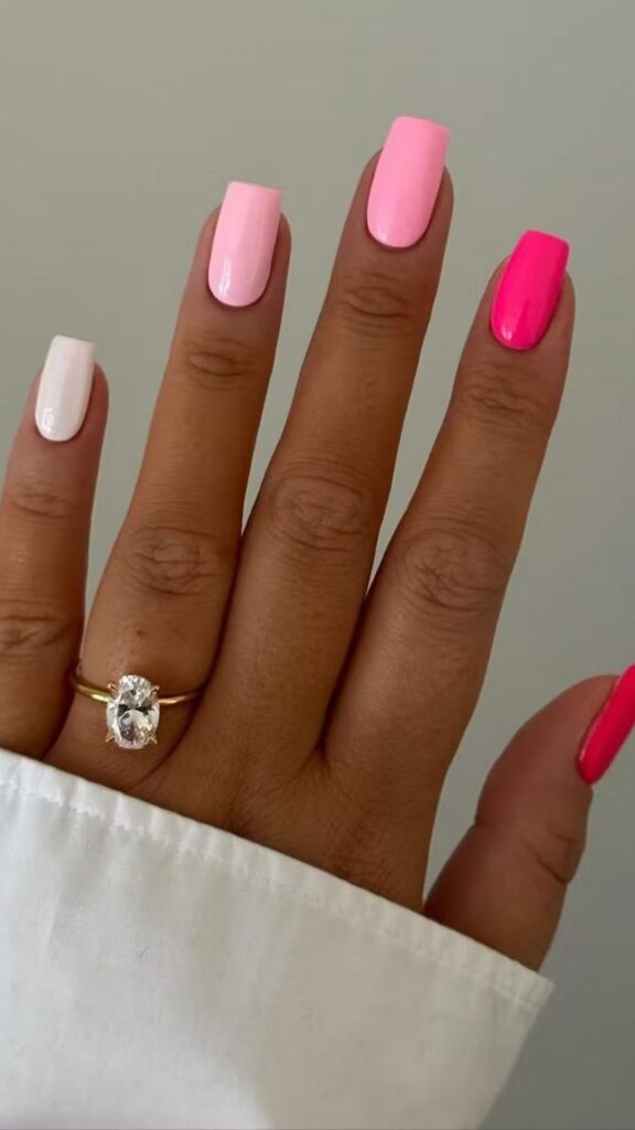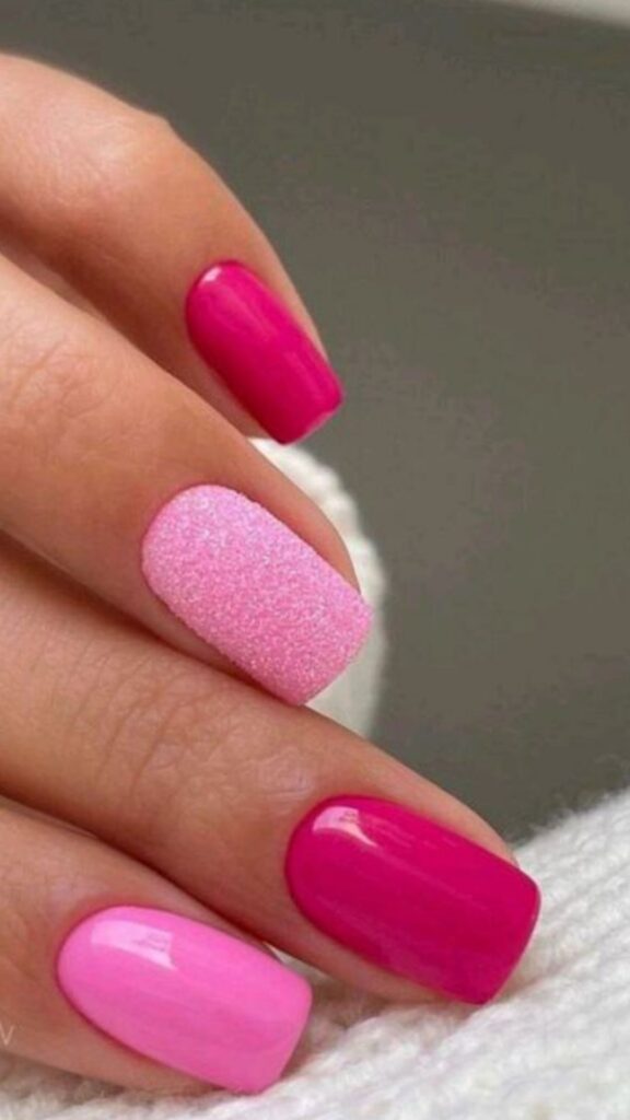 A mix of soft baby pink and bright hot pink on short square nails. Simple yet bold with a fun color contrast.