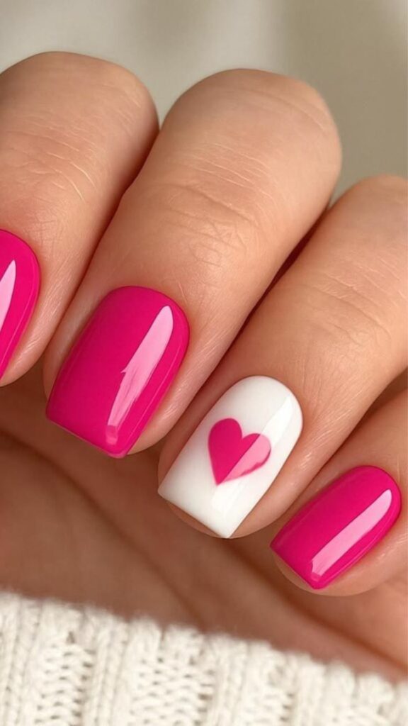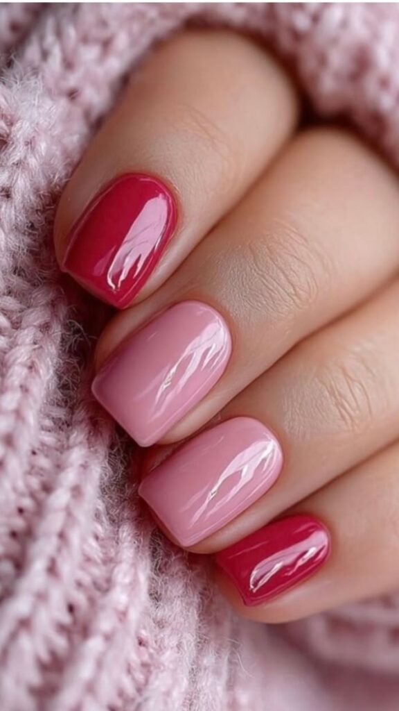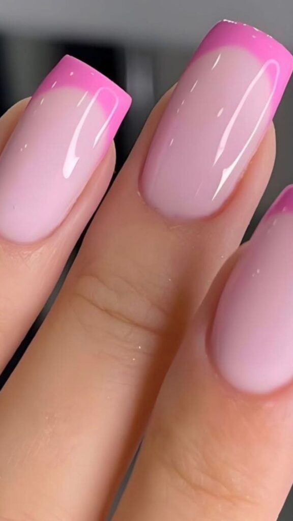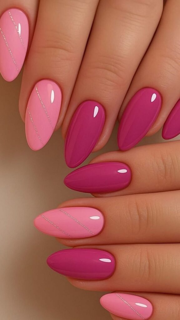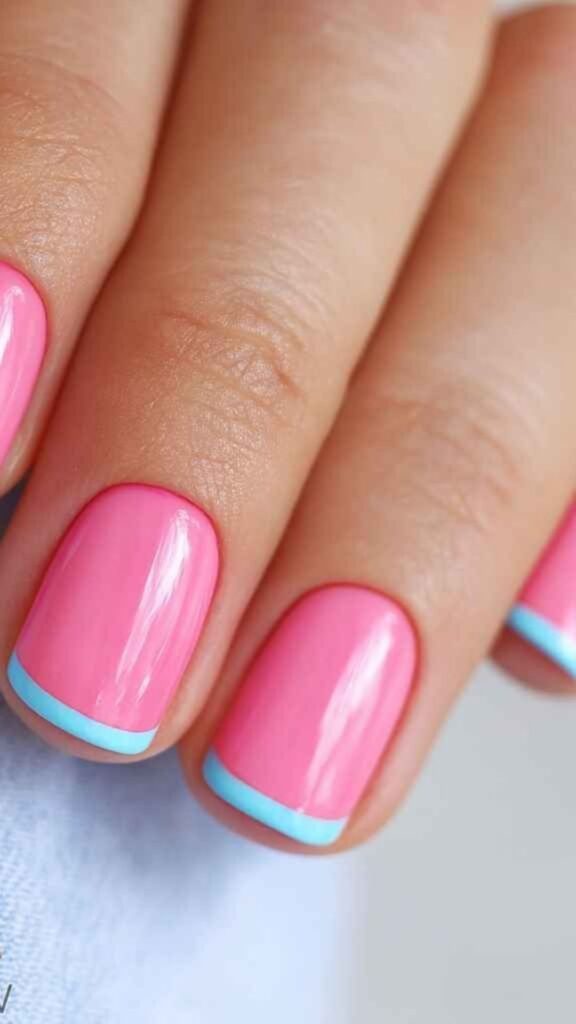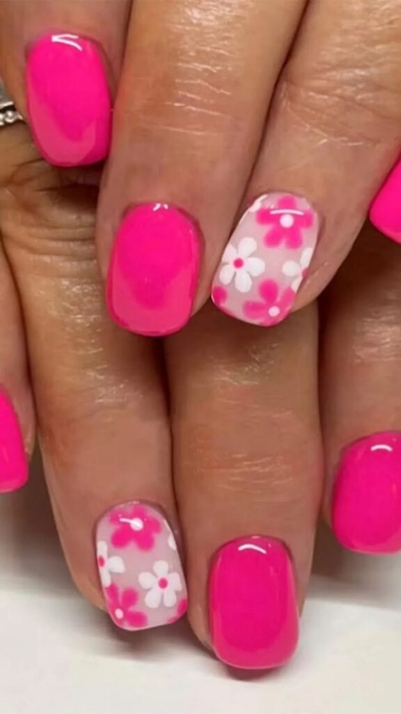 A mix of soft baby pink and bright hot pink on short square nails. Simple yet bold with a fun color contrast.