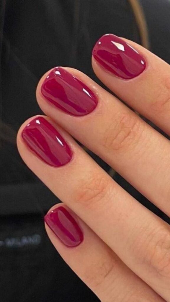 Classic glossy pink nails of medium length. Minimalistic and elegant.