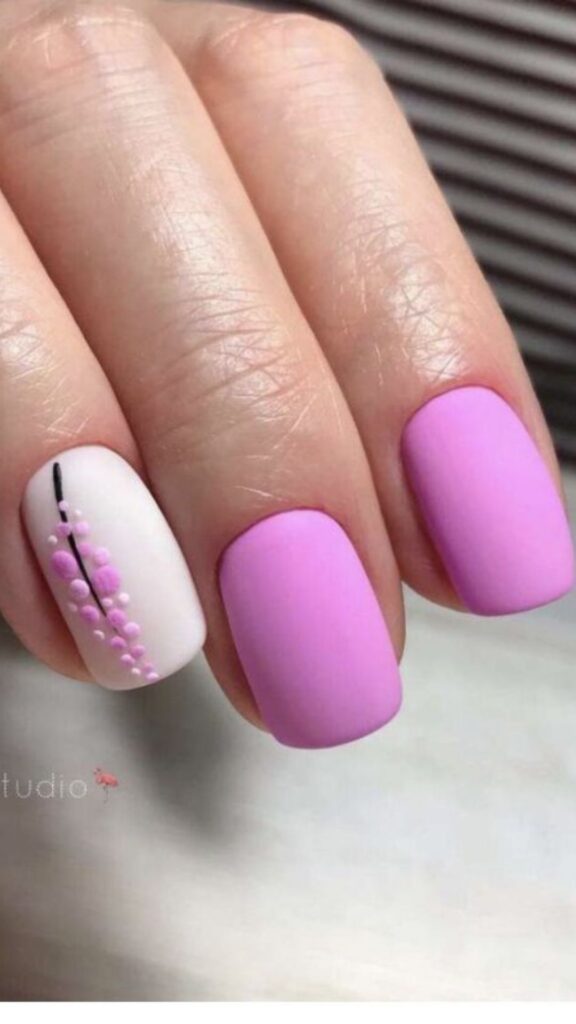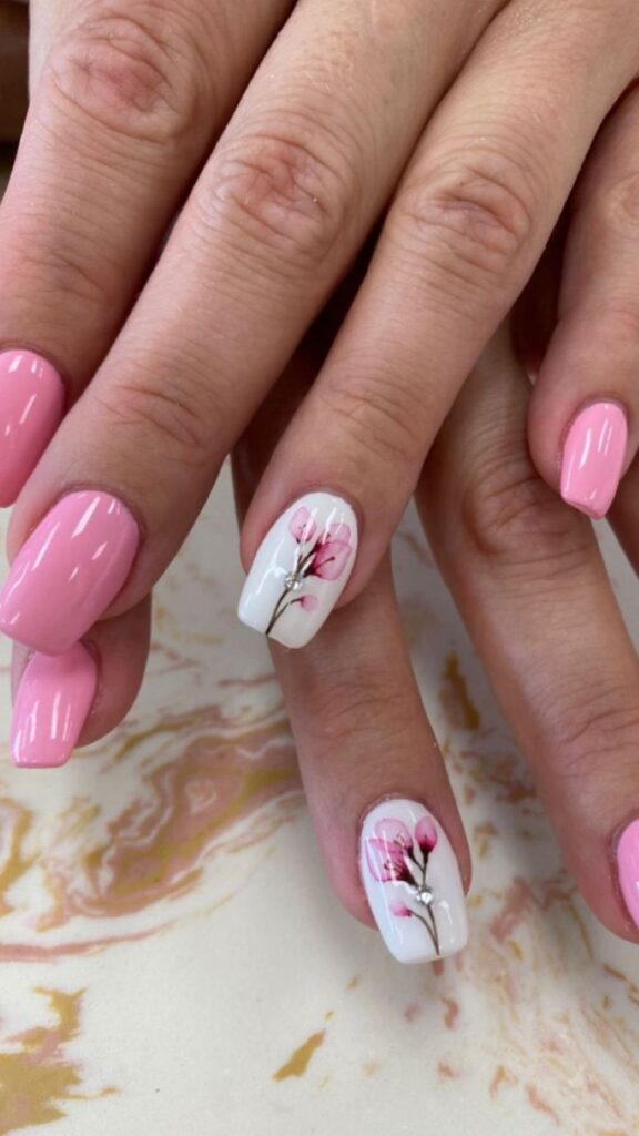 A combination of matte lilac-pink and a white accent nail decorated with rhinestones and a delicate branch design. Slightly festive and eye-catching.