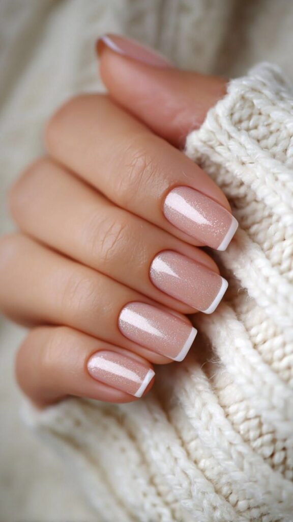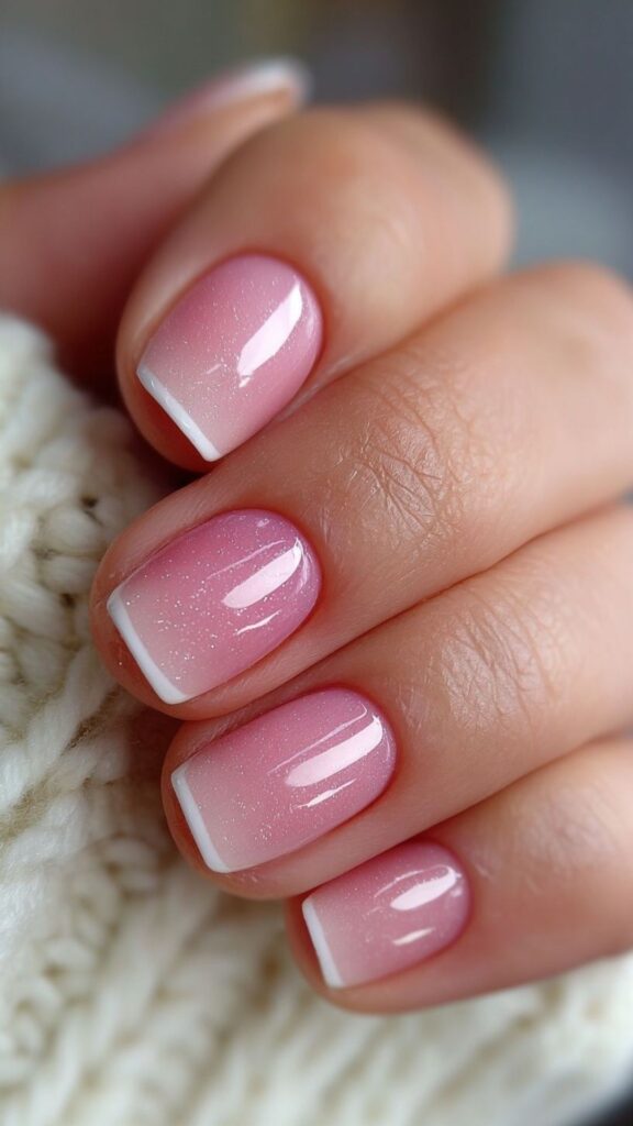 Short oval nails in a sheer pink shade with delicate shimmer. Soft, romantic, and slightly translucent.