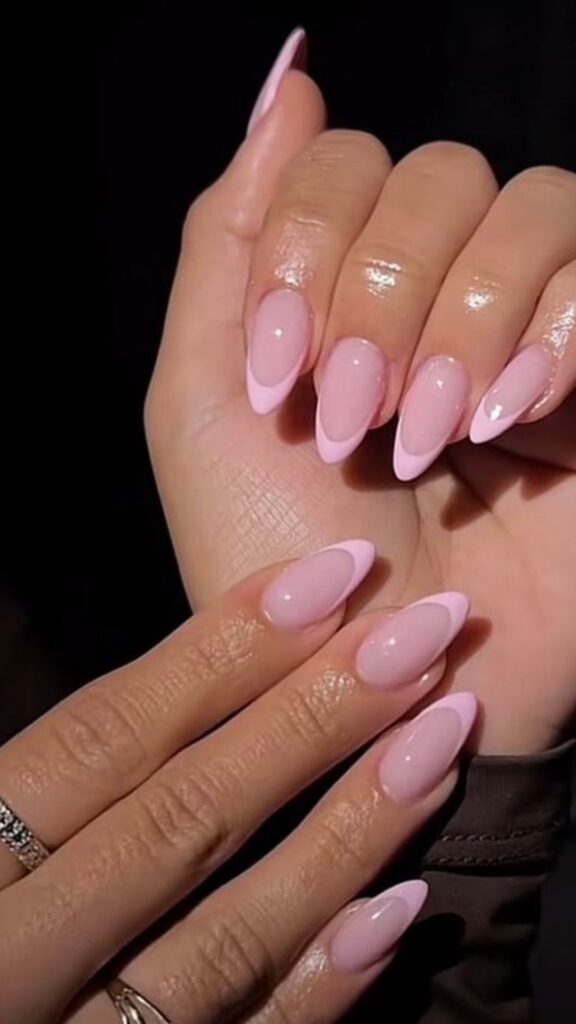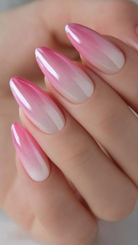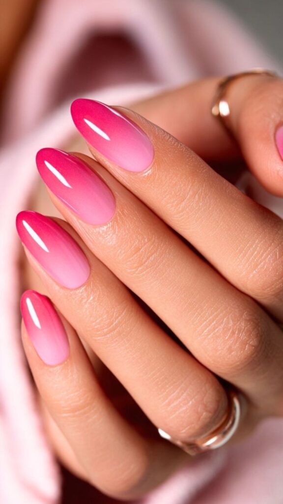 Almond-shaped nails with a pink French tip: nude base with bright pink gradient tips. Feminine and neat.