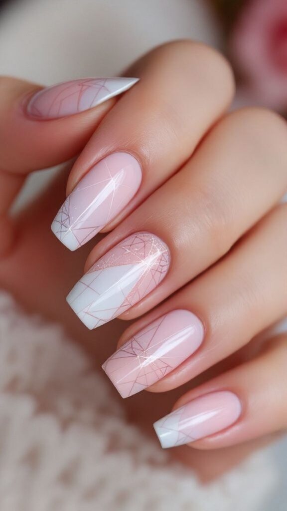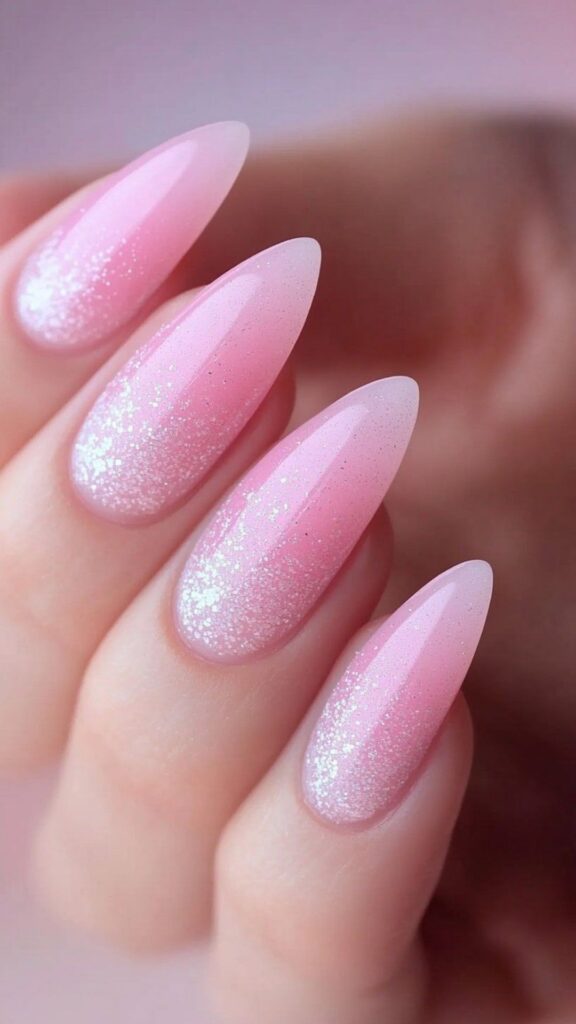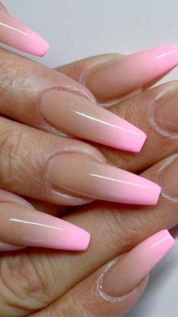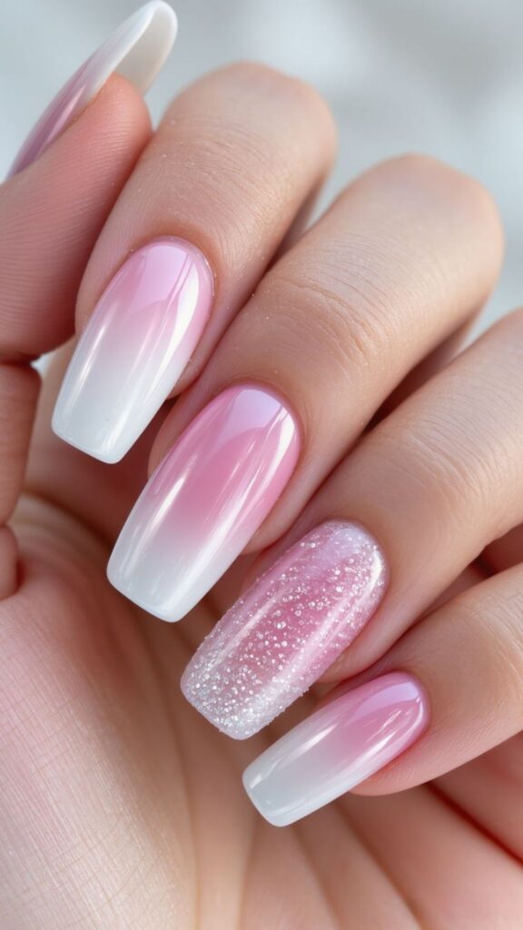 Long coffin-shaped nails with a pink-to-white ombré effect and subtle glitter accent. Soft and glamorous.
