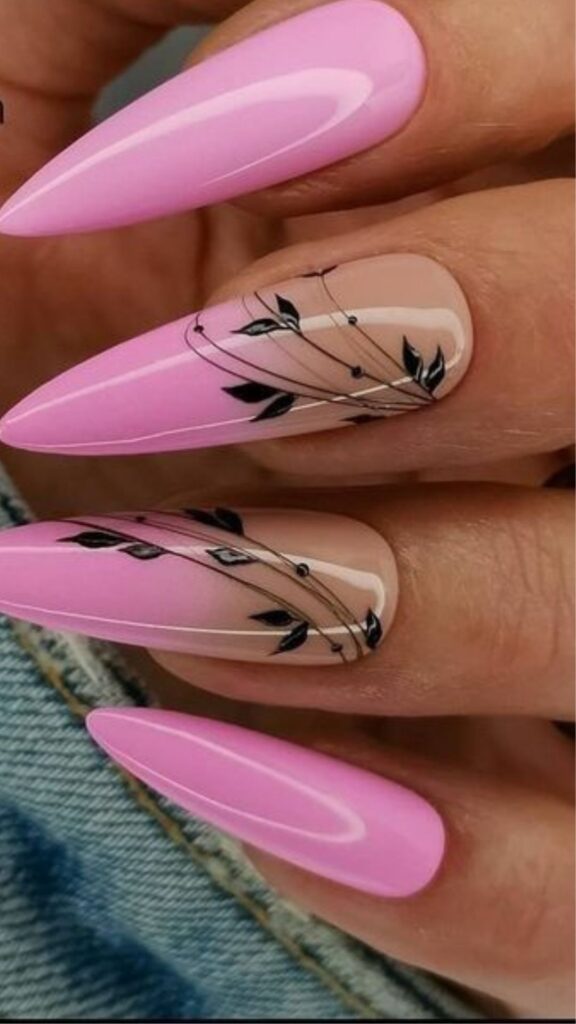 Long almond-shaped nails in soft pink with fine black floral line art. Elegant and artistic.