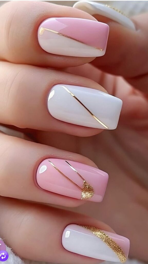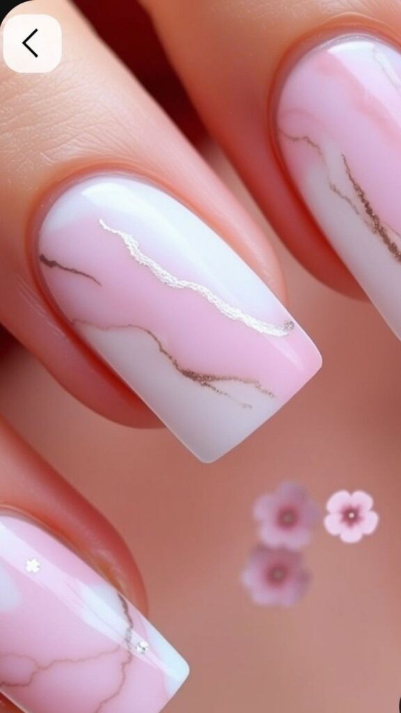 Long square nails with a pink and white marble effect and thin gold lines. Elegant and airy sty