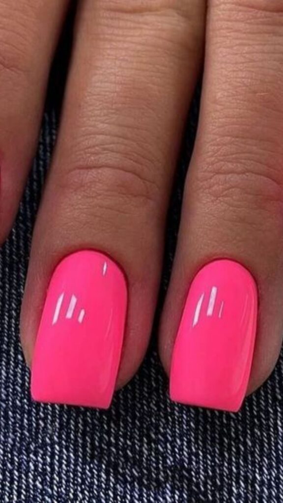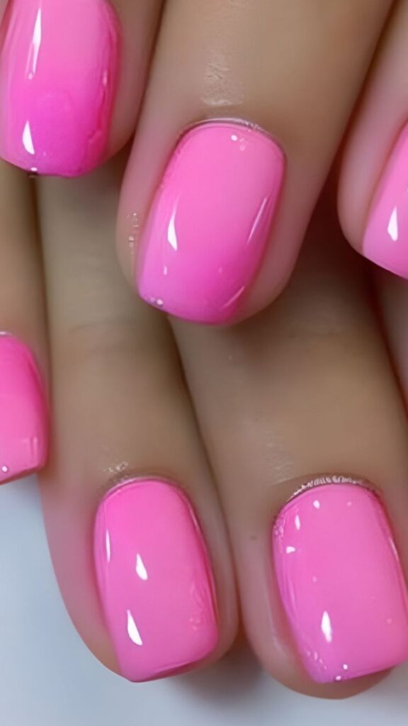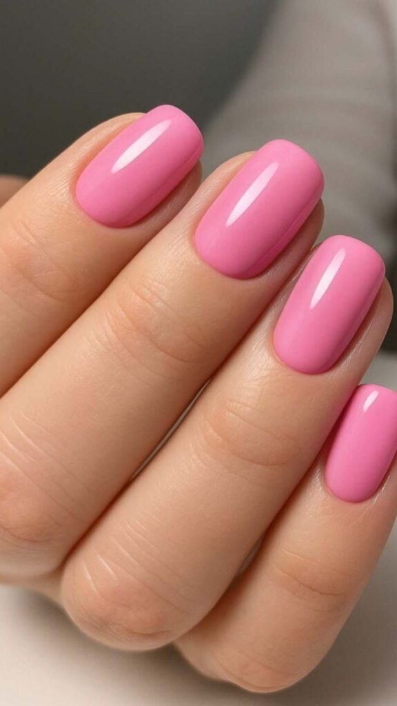 Short square nails in vibrant bubblegum pink with a glossy finish. Bold and playful.
