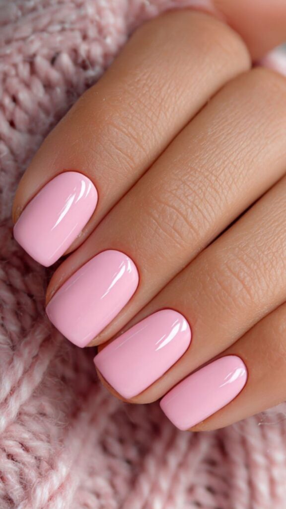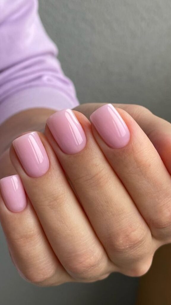 Short square nails in classic glossy soft pink. A versatile everyday option.