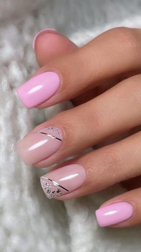 Glossy pastel pink manicure with a minimalist silver line accent on one nail. Chic and understated.
