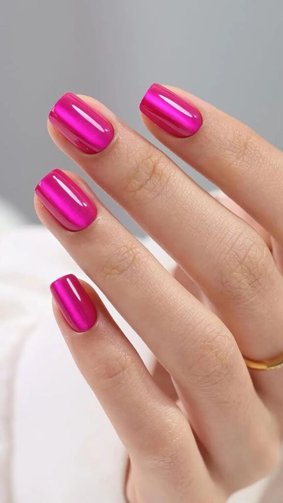 Metallic chrome pink nails with a mirror-like finish. Eye-catching and ultra-modern.