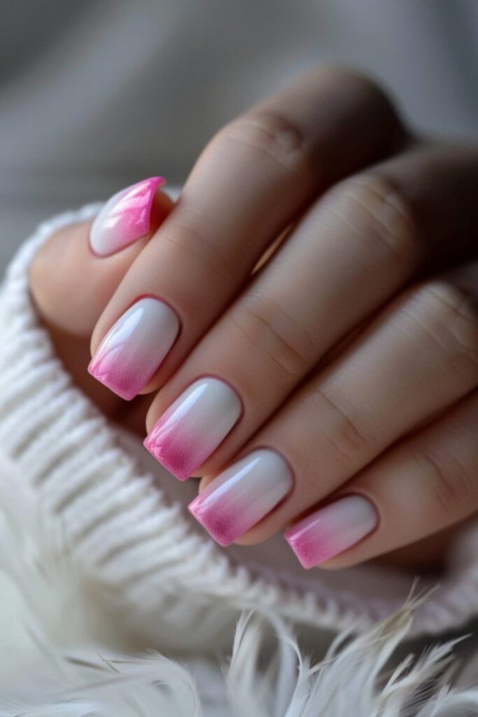 A mix of soft baby pink and bright hot pink on short square nails. Simple yet bold with a fun color contrast.