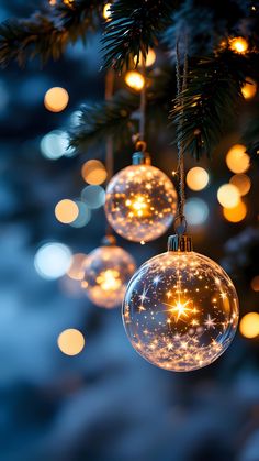 Elegant Christmas ornaments sparkling on a tree branch, creating a dreamy festive glow.