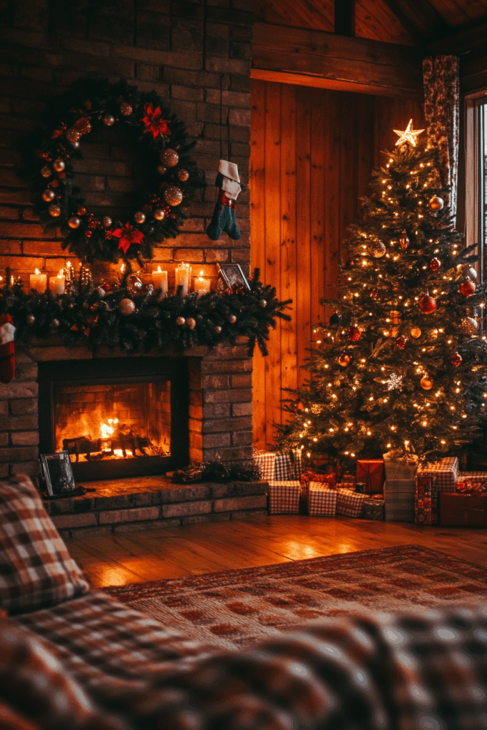 A dreamy Christmas living room filled with twinkling lights, warm textures, and a beautifully decorated tree — holiday magic in every detail.