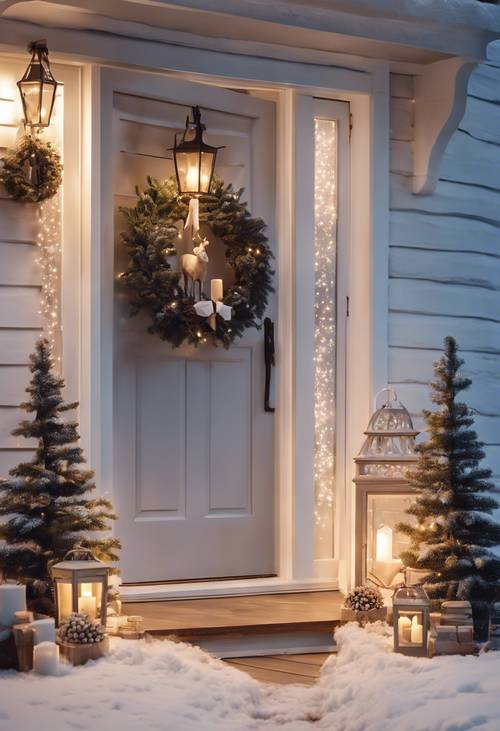 A peaceful snowy front porch with a Christmas wreath and lanterns, creating a soft and elegant winter aesthetic.
