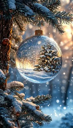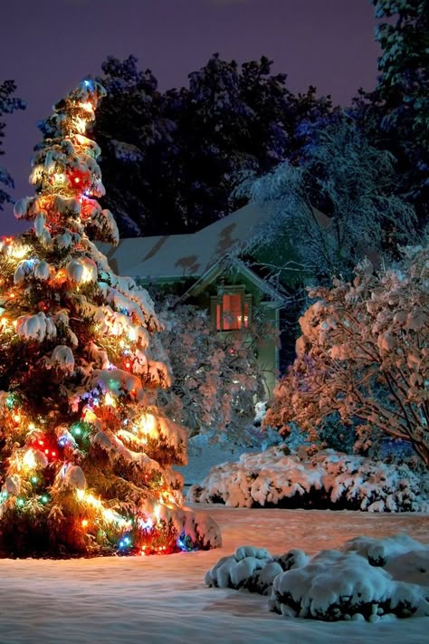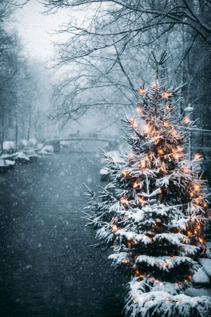A glowing Christmas tree standing in the snow, surrounded by magical winter light — the perfect aesthetic holiday wallpaper.