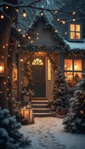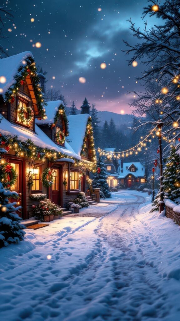 A charming winter street covered in snow, glowing with Christmas lights and cozy village vibes.