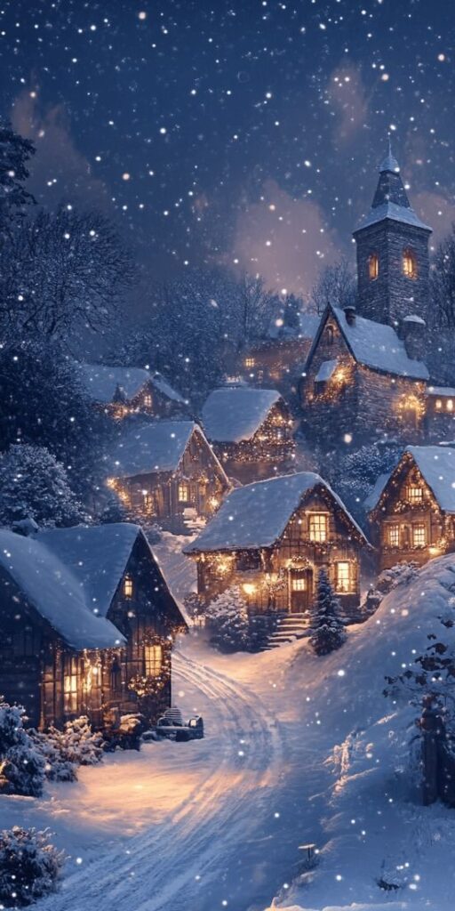 A fairytale-like snowy village glowing with warm lights — a magical Christmas night brought to life.