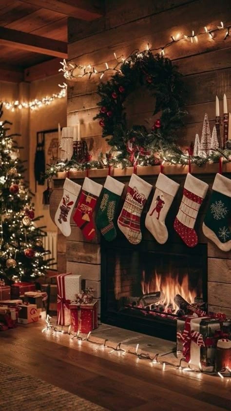 A warm and cozy Christmas fireplace aesthetic with stockings, golden lights, and festive holiday charm — the perfect winter wallpaper.