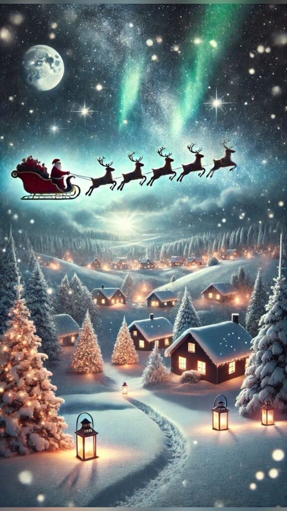 Santa’s sleigh flying under the northern lights above a glowing winter village — a magical Christmas fantasy.