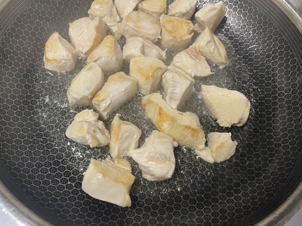 - Heat oil in a pan over medium-high heat. Add the chicken and cook until lightly golden (about 5–7 minutes). Remove from the pan and set aside.
